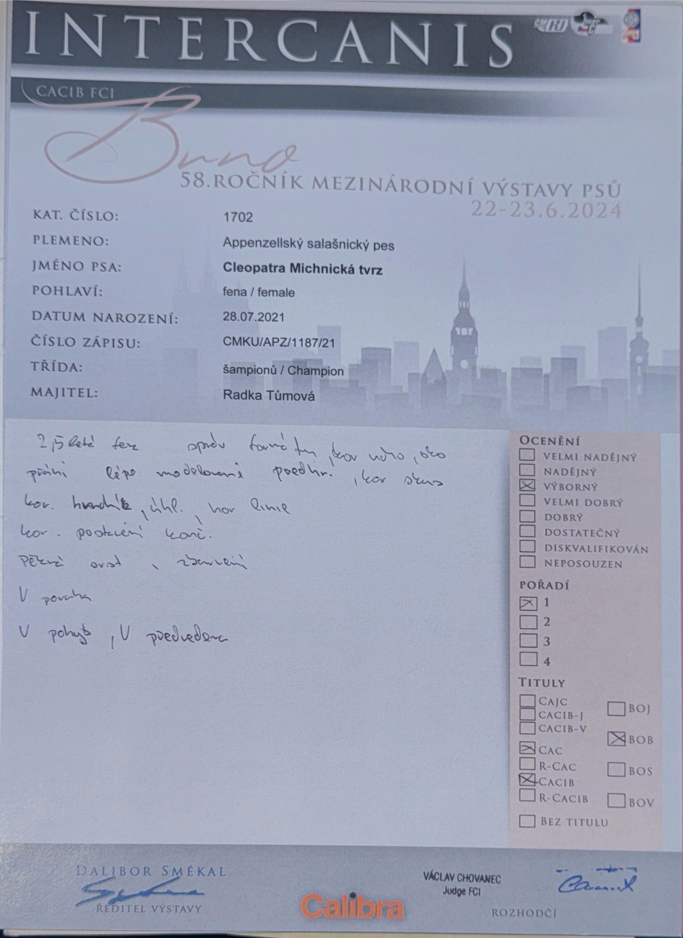 Tahle výstava pro nás byla hodně specifická, jelikož panička byla po operaci kolene a nemohla se mnou běhat v kruhu, tak zaskočil páníček. Vyplesklí jsme z toho byli asi všichni tři, ale od pana rozhodčího Chovance se páníčkovi dostalo velikého uznání a společně jsme získali ocenění nejvyšší! No, snažila jsem se, aby si se mnou páníček třeba ještě někdy v kruhu zaskotačil... 😍